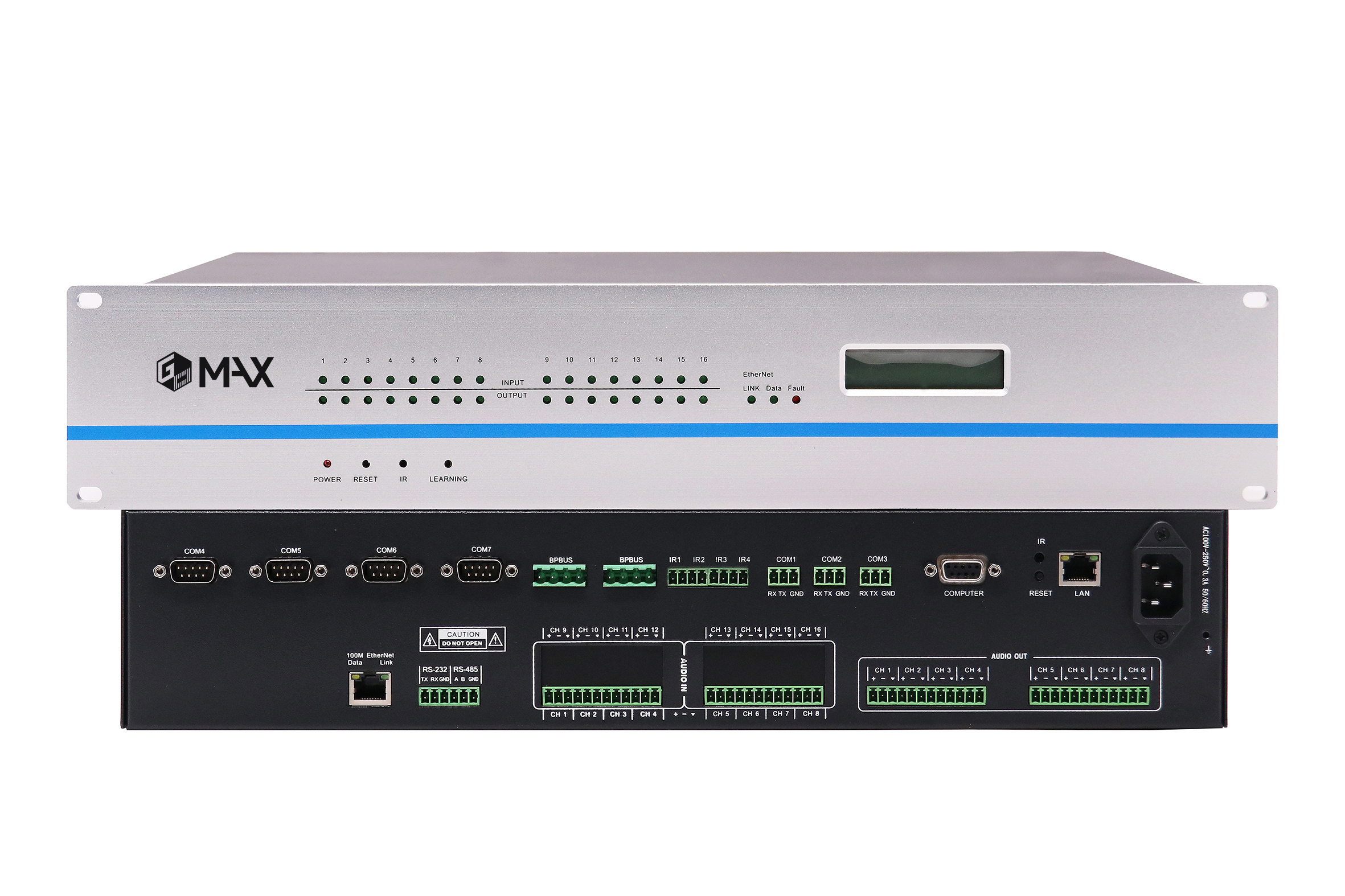 8路雙向可編程RS-232通訊接口;(其中一路內置機器內部,用來控制音頻處理器,一路內置485接口);